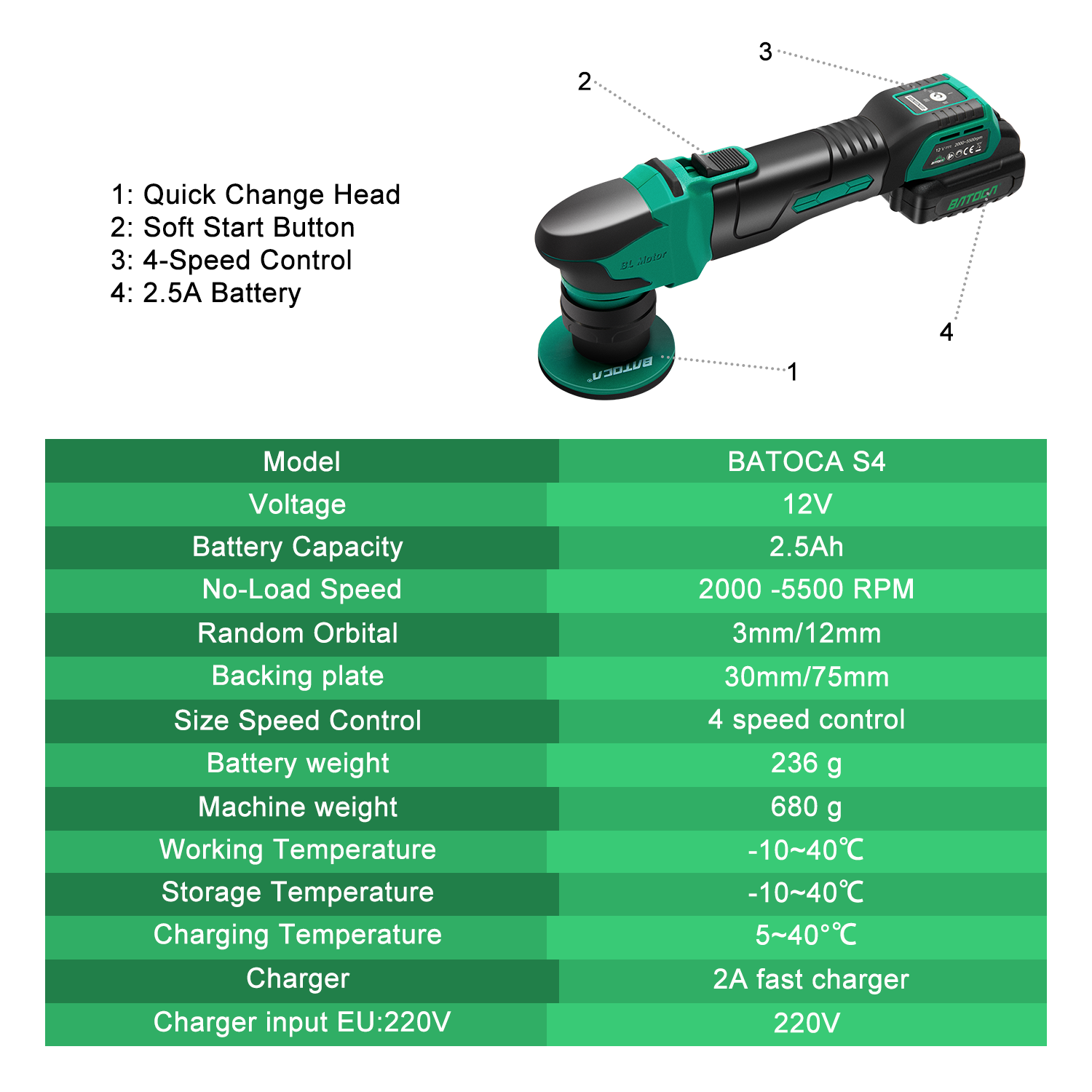 BATOCA S4 Cordless Car Polisher Mini Nano Wireless Polishing Machine Kit Quick Change Heads Brushless Motor 3/12mm Orbital