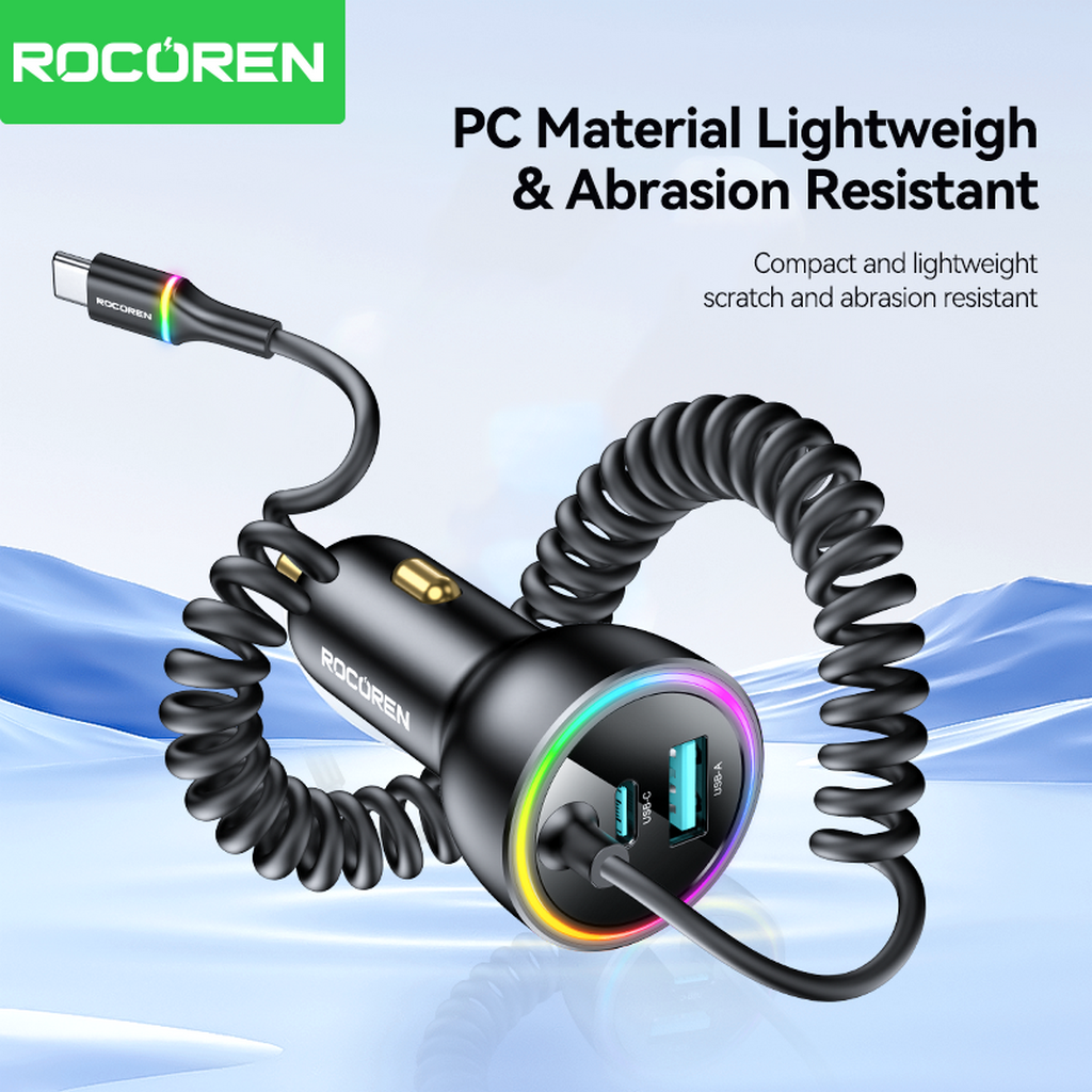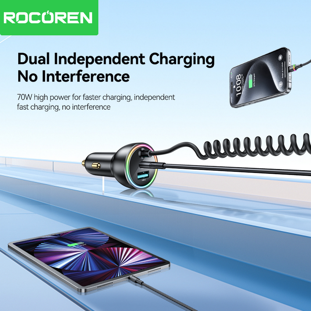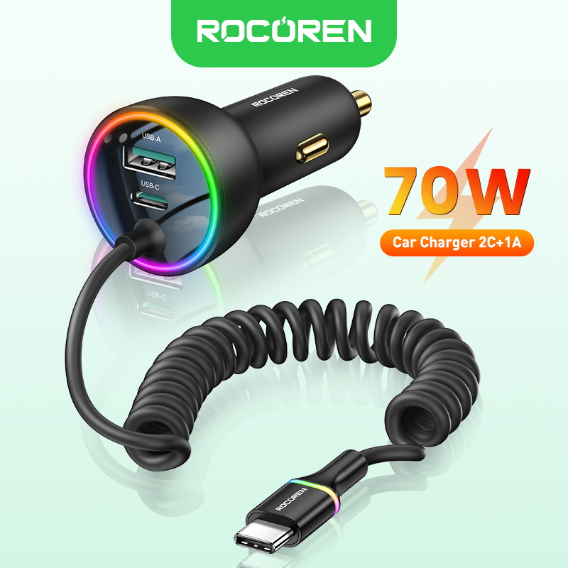 Rocoren 70W Car Charger Retractable Spring Cable PD QC SCP FCP AFC Fast Charging For iPhone Samsung Xiaomi Car Phone Charger