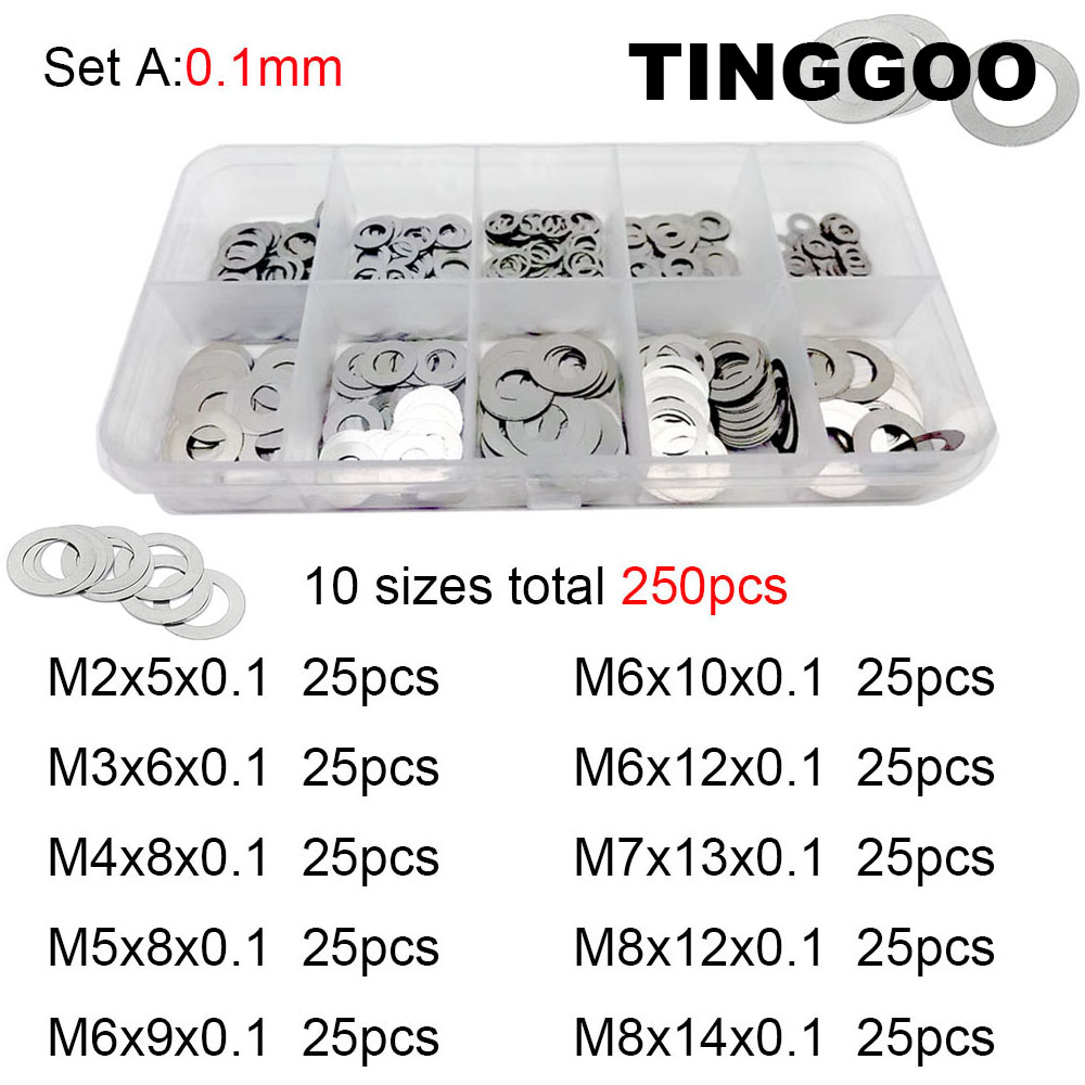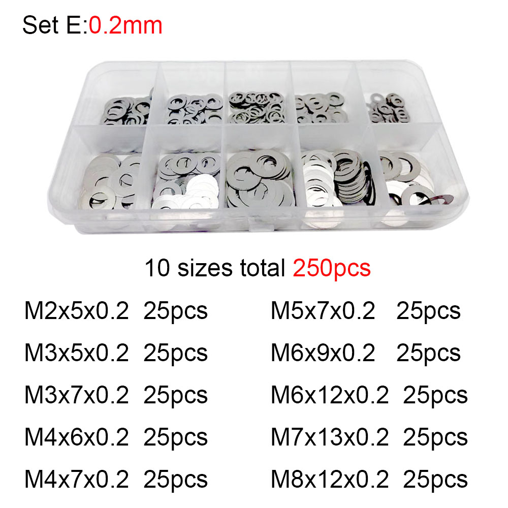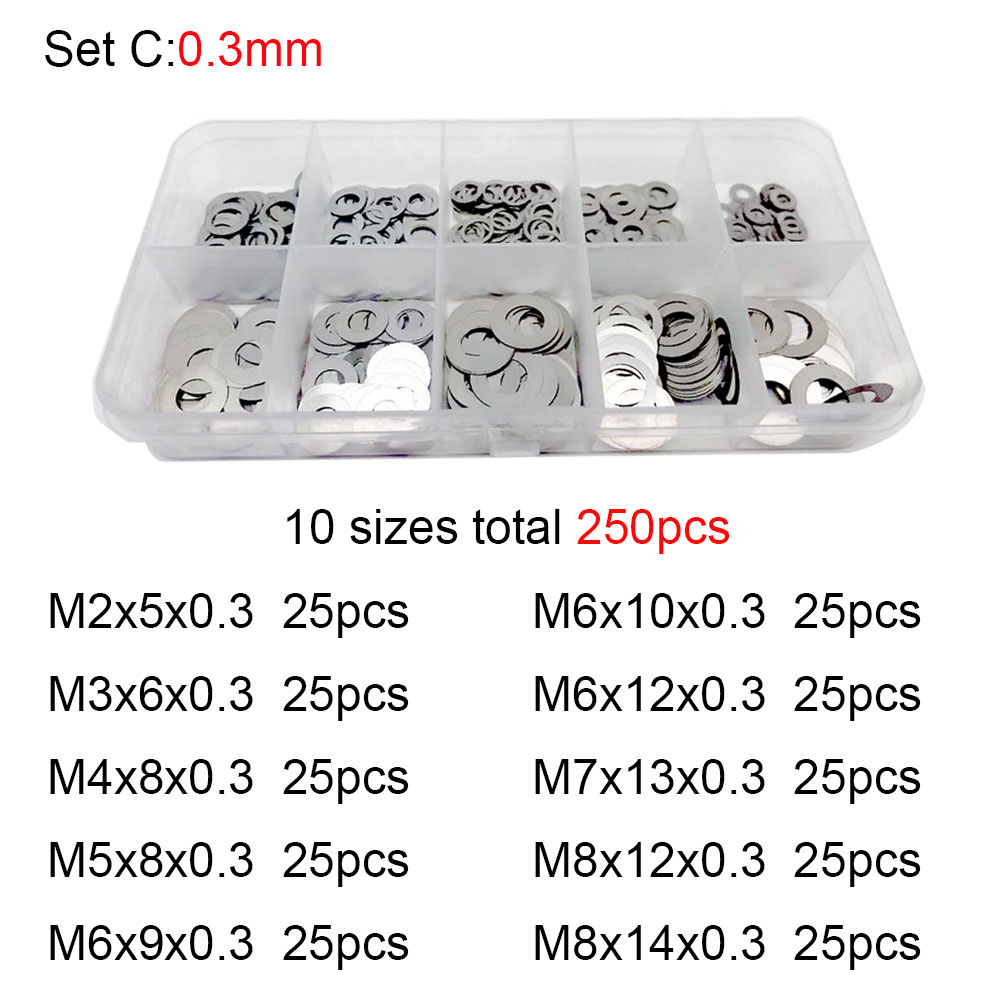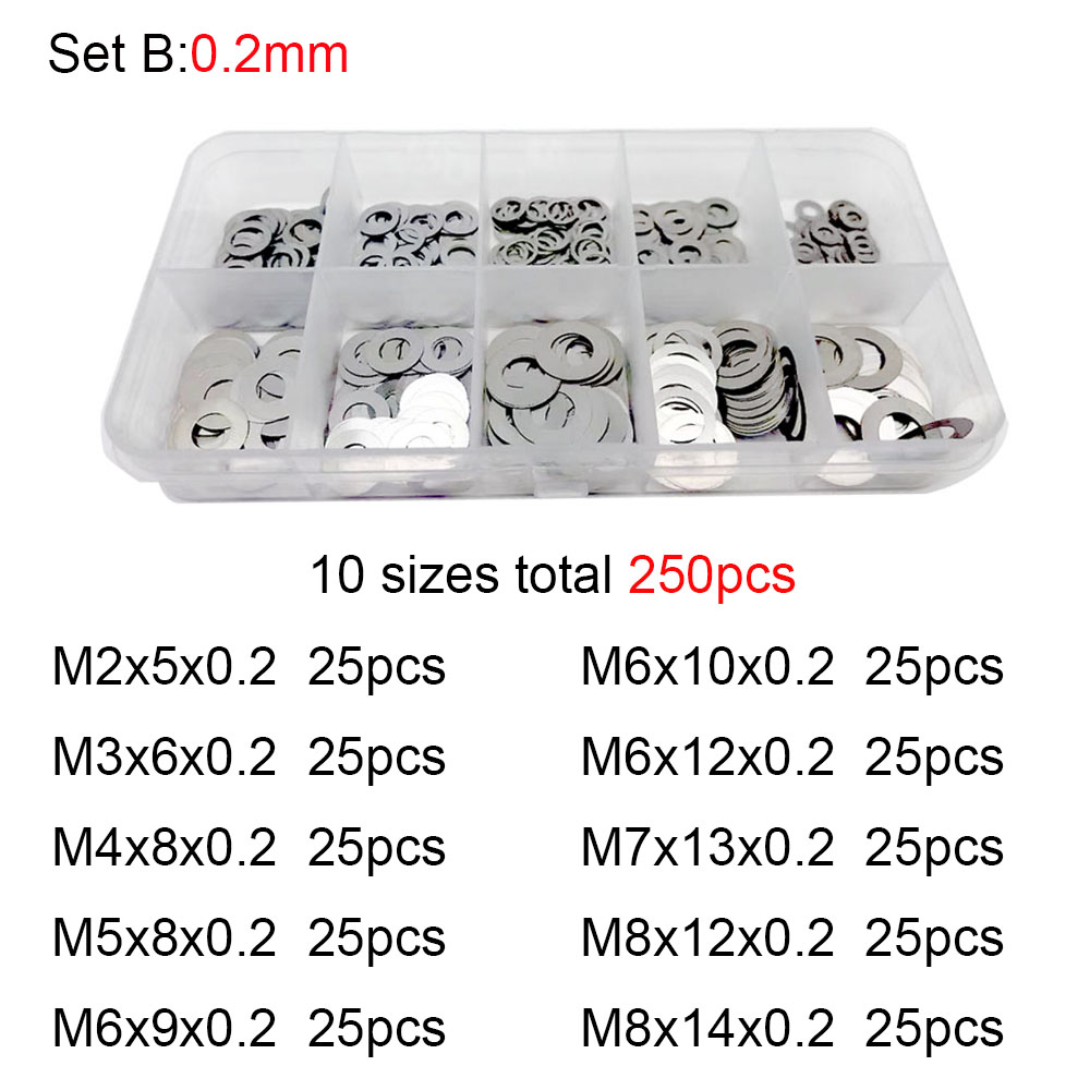 250x 0.1/0.2/0.3mm M2 M3 M4 M5 M6 M7 M8 304 Stainless Steel Ultra Thin Washer Set Adjusting Shim Plain Gasket Assortment Kit Box