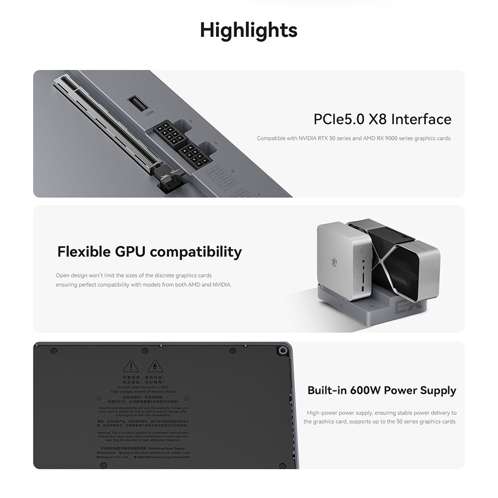 Beelink External GPU Docking Station PCIe×16 Slot Built-in PSU/SSD/Wi-FI Module/External Antennas, for GTI14 155H/185H GTi12/13