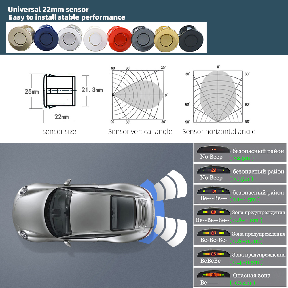 Car LED Parking Sensor Kit 4 Sensors 22mm Backlight Display Reverse Backup Radar Monitor System 12V 8 Colors