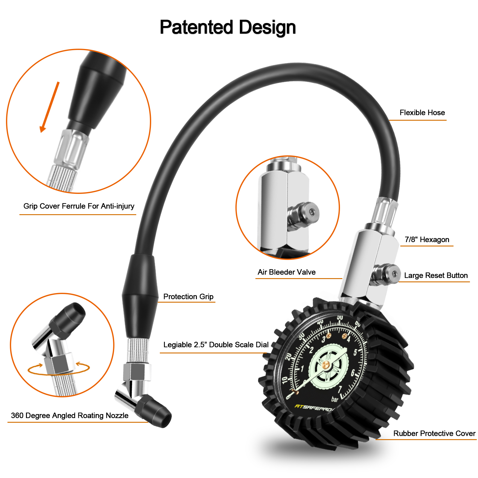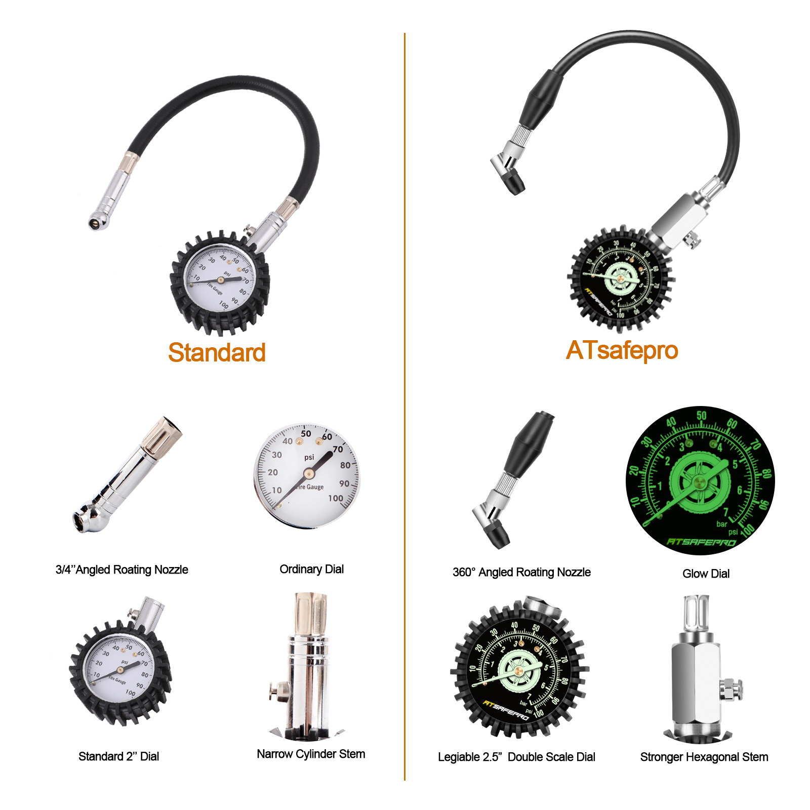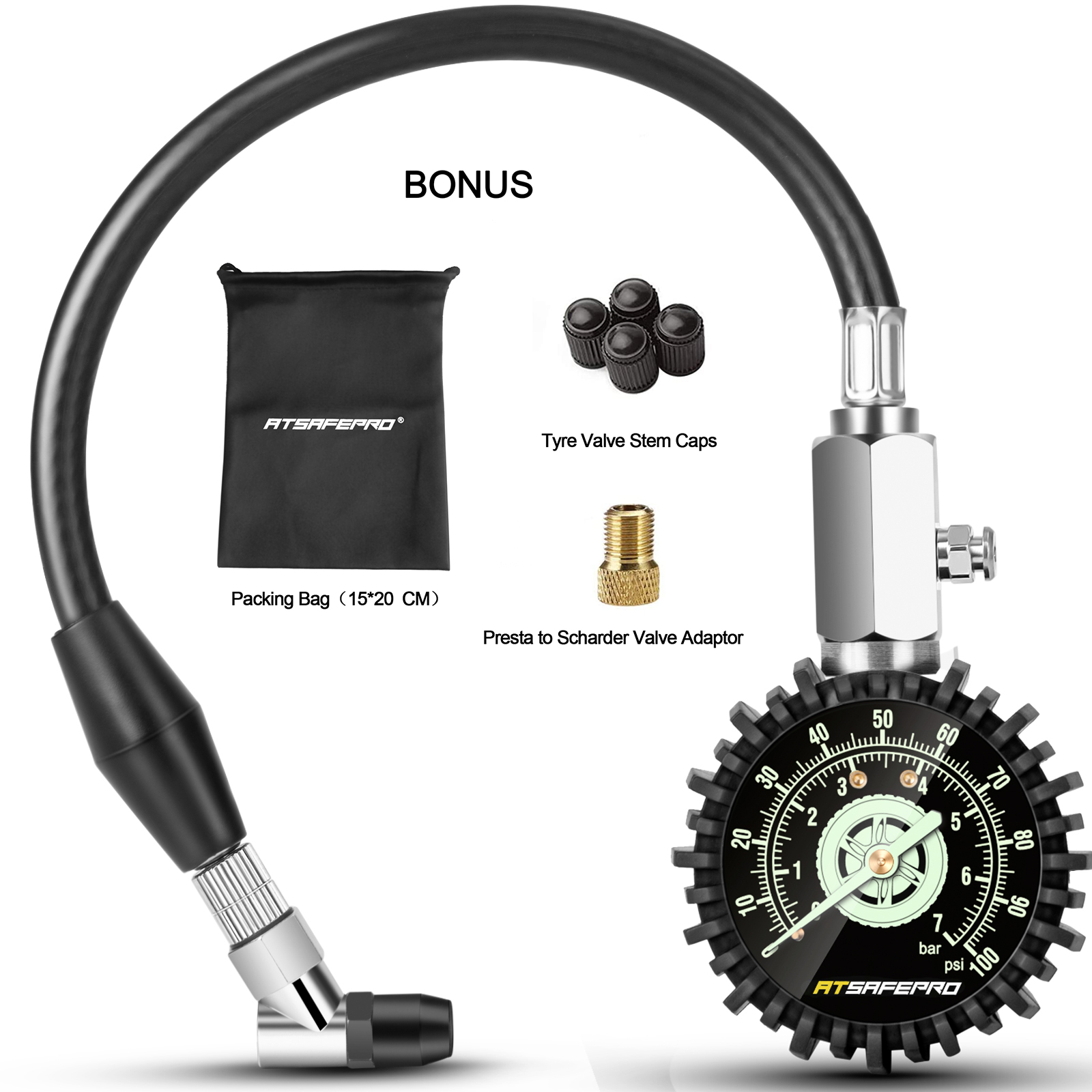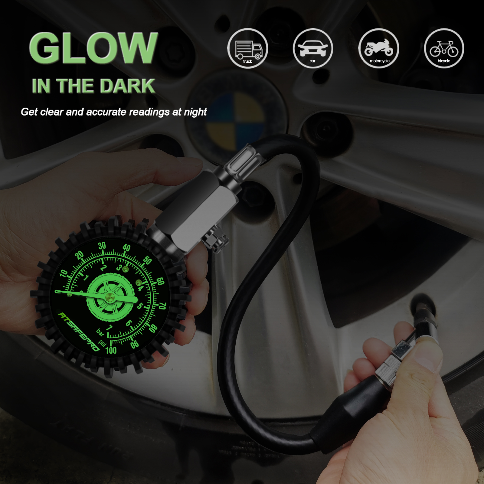 ATsafepro Tire Pressure Gauge 100 PSI 30 PSI 15 PSI Glow in The Dark 2.5'' Dial Mechanical Tyre Gauge Flexible Hose Angled Chuck