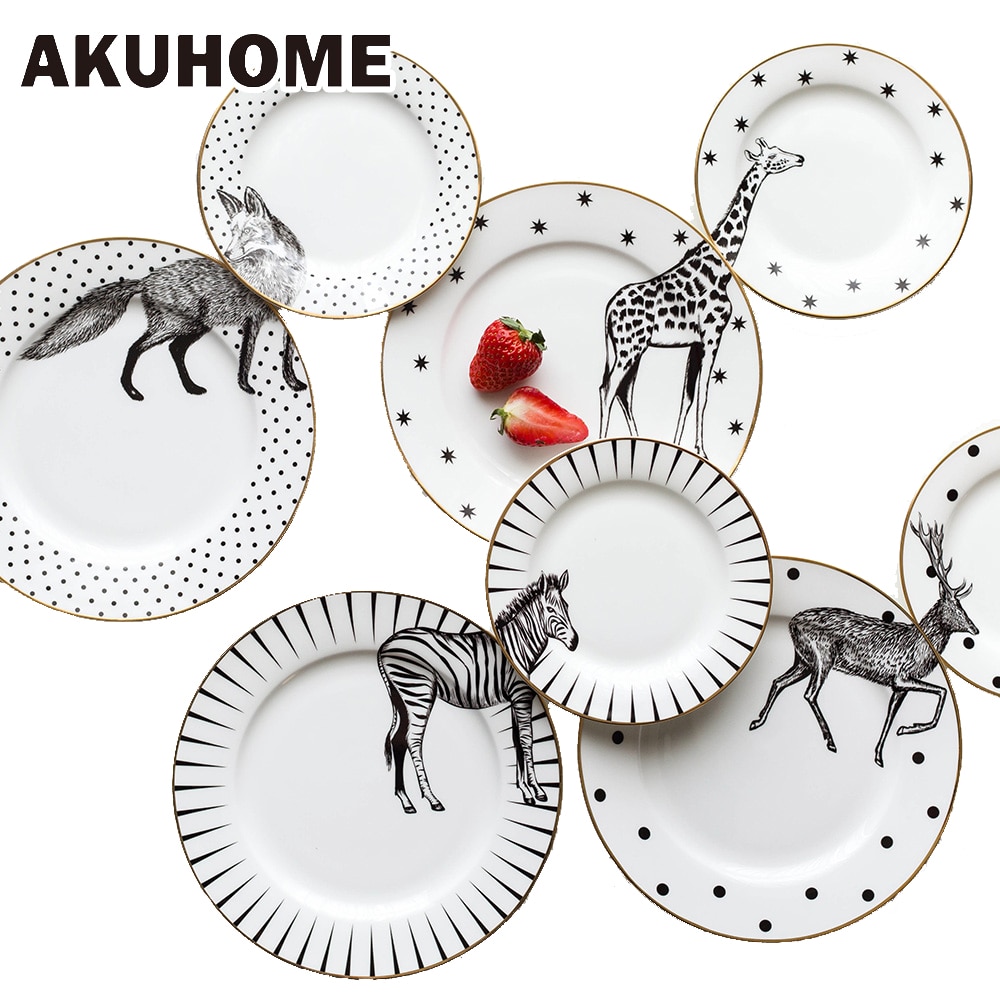 2 Pcs 6&8 Inch Animal Combined Plates Set Ceramic Plates Fox Elk Giraffe Zebra Pattern Plates Steak Breakfast Cake Fruits Dish