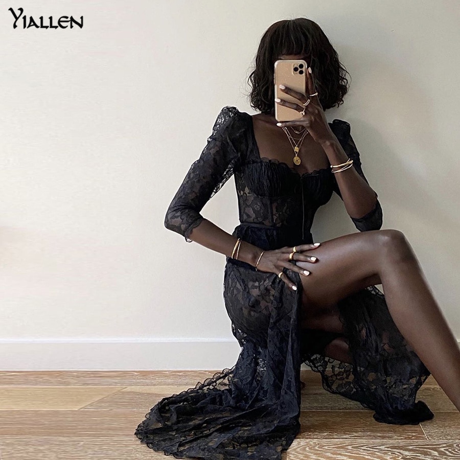 Yiallen 2021 Y2k Fashion Party Vacation Beach Sexy Black Lace Long Dress Women's Spring Quarter Sleeve Mid-Calf Dresses Clubwear