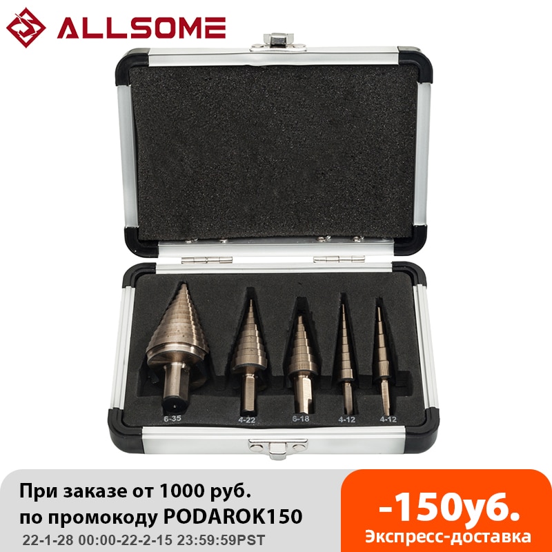 ALLSOME 5pcs Metric/Inch Hss Cobalt Step Drill Bit Set Multiple Hole 50 Sizes with Aluminum Case