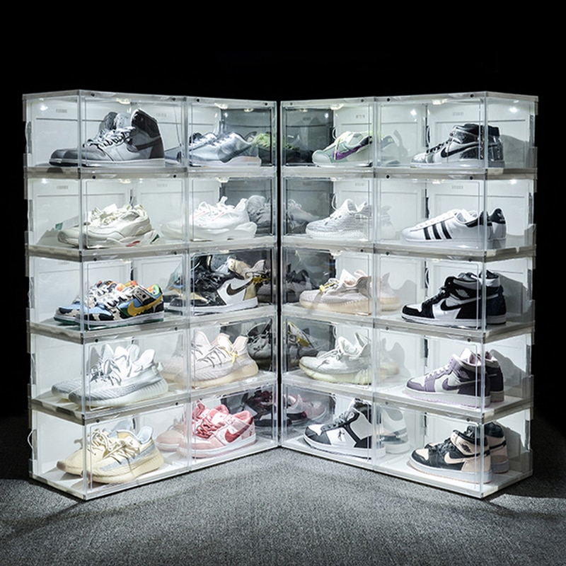 Clear LED Light AJ Shoe Box Sneakers High Tops Organizer Voice Control Shoebox Stackable Football Shoes Collection Display Rack