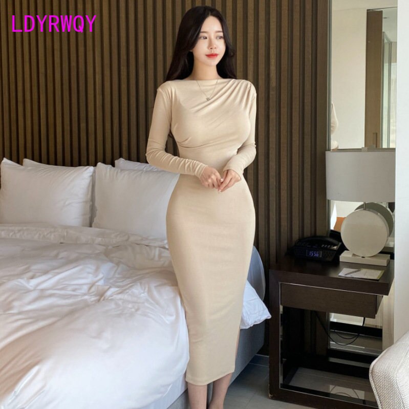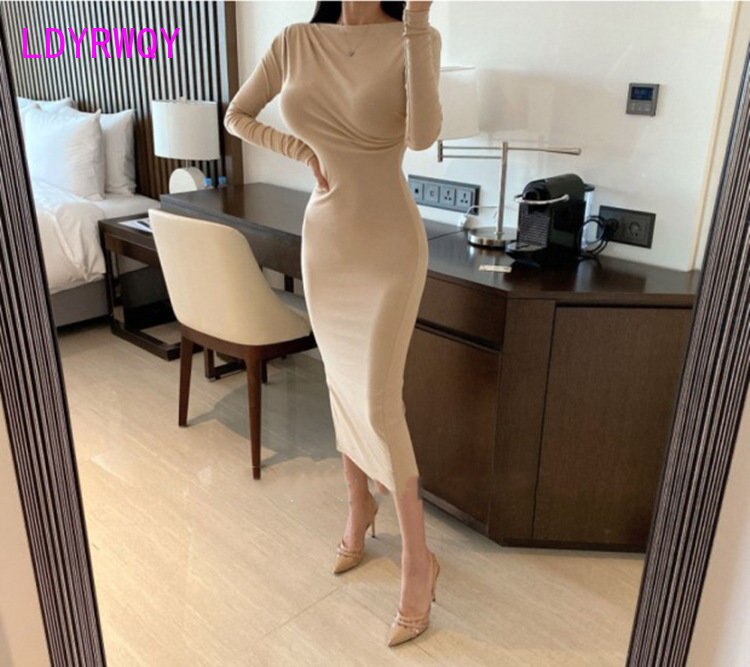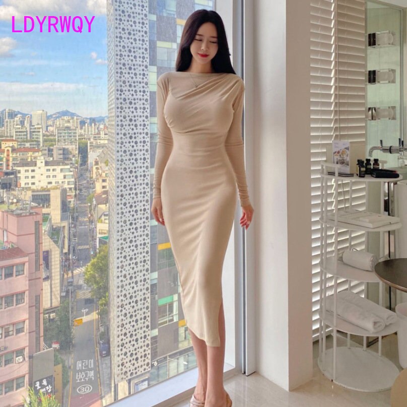 Південна Корея 2022 осінь зима новий однорядний комір плечовий сумка стегна сексуальна довга спідниця щілина довгий рукав плаття високої талії
