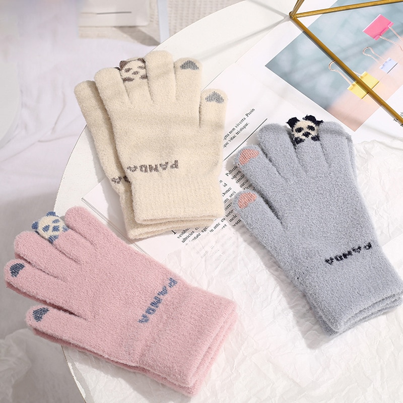 Зимові трикотажні рукавички для жінок Симпатична мультфільм Панда Додати оксамитовий теплий сенсорний екран Холодна рукавичка на відкритому повітрі Велосипедні лижі Вітрозахисні рукавички
