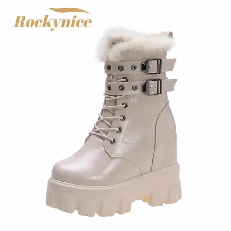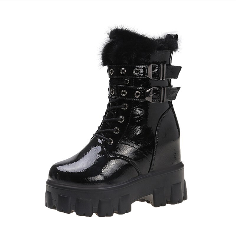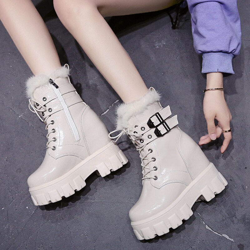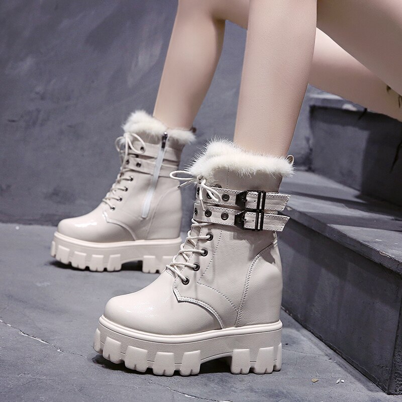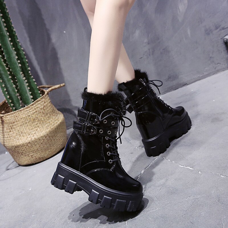 Черевики для щиколоток Жінки зимові теплі хутряні чоботи для мотоциклів Нові британські високі платформи Sneaker 10CM підбори товсті нижні плюшеві шкіряні чоботи