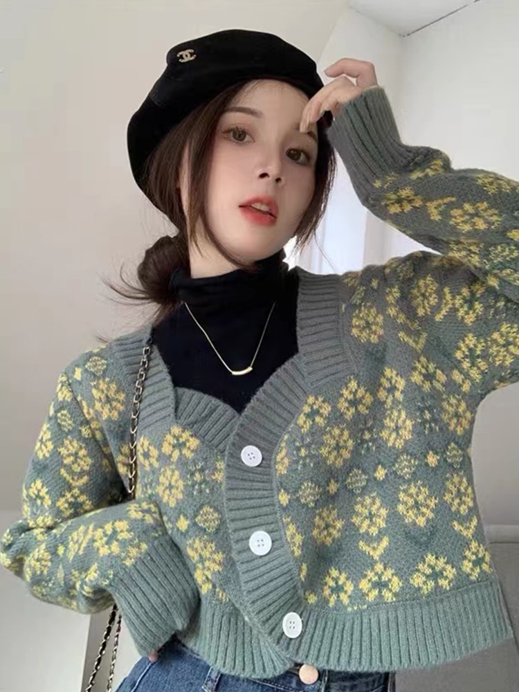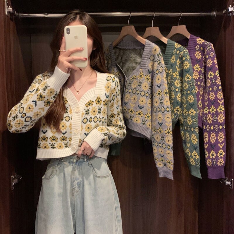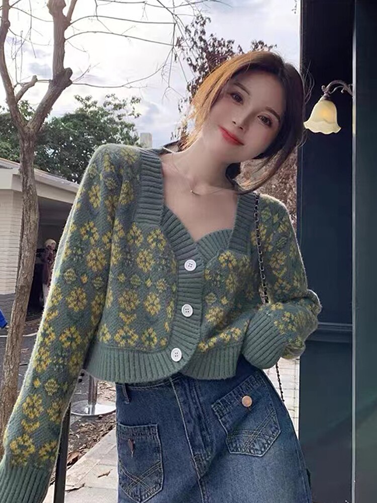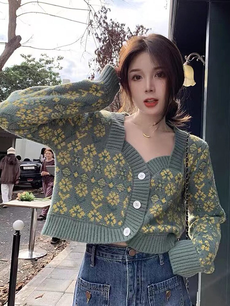 2022 New Chic Flowers Knit Sweater Female Cardigan Sweet Square Short Long Sleeves Top Women Casual Clothes korean Fashion