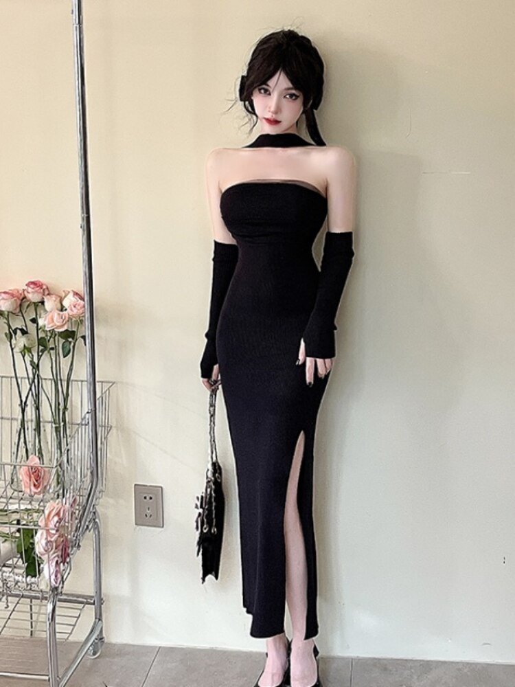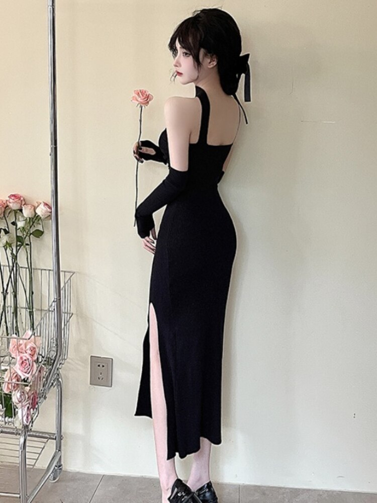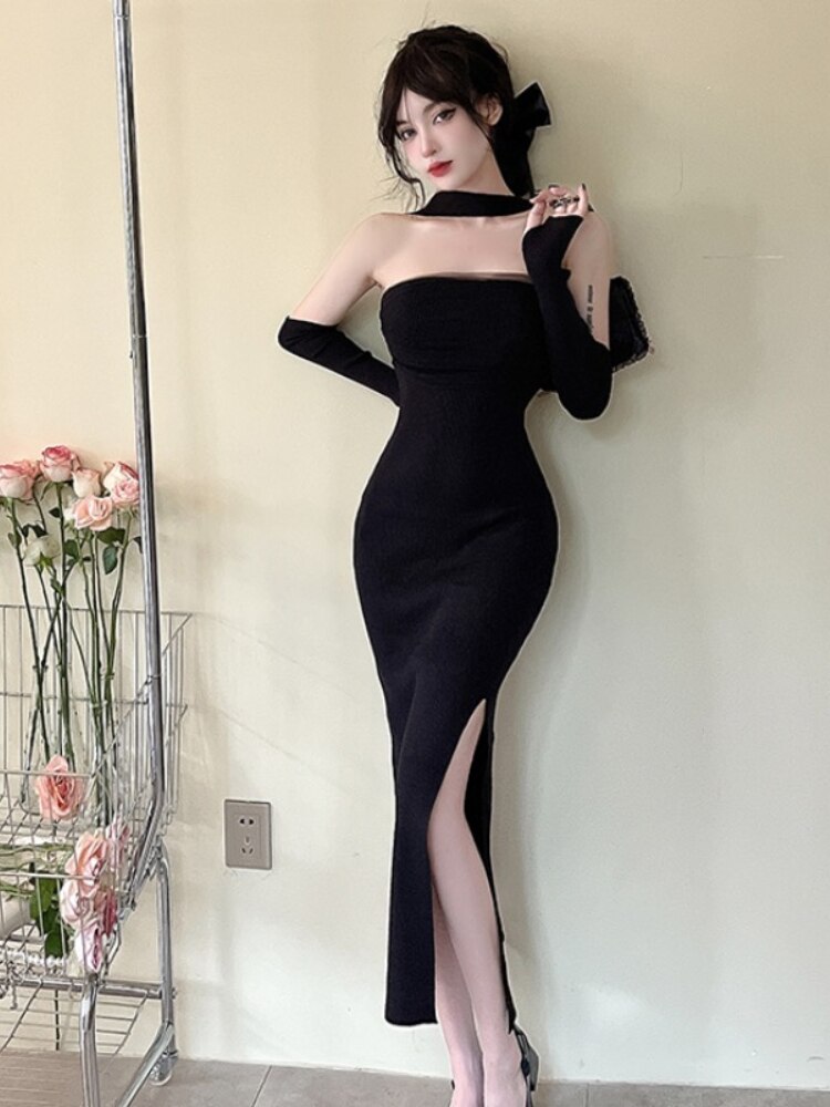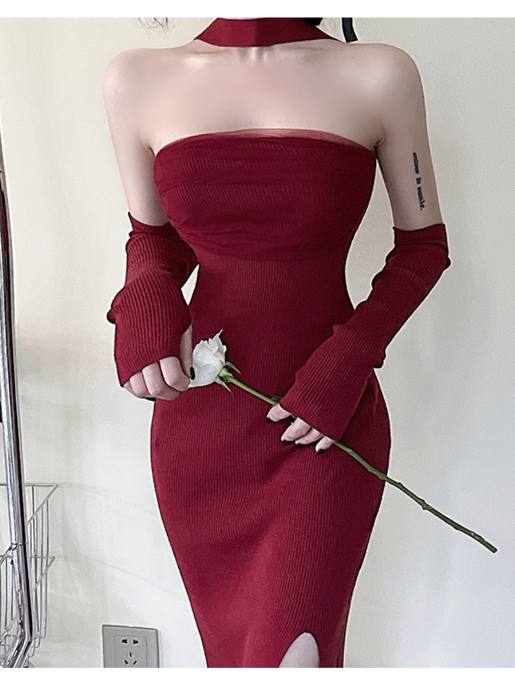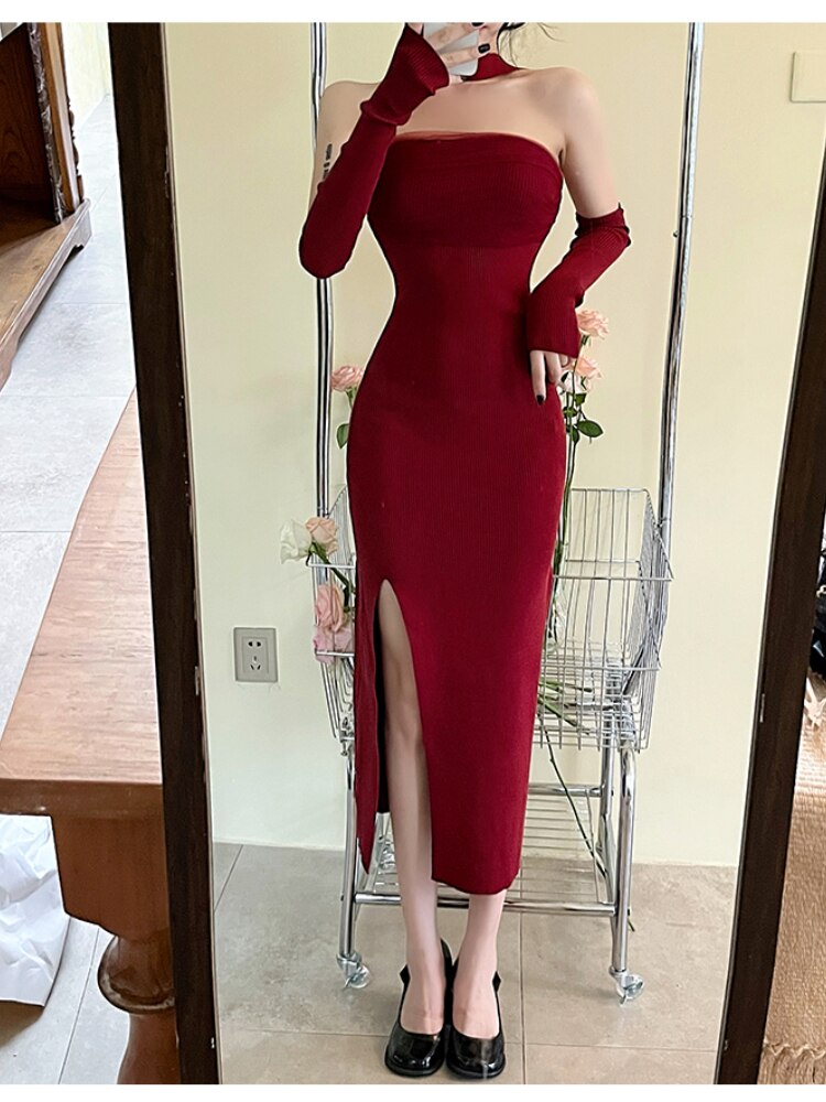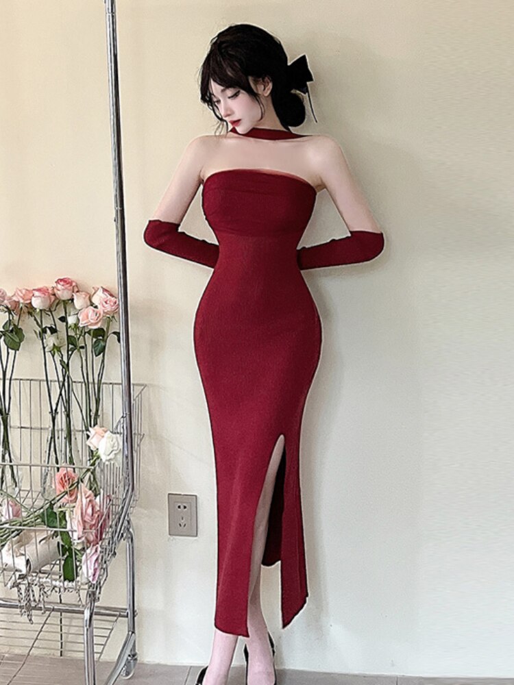 Christmas Red Dress Women Sleeveless Halter Split Sexy Solid Stretch Slim Backless Vintage Ladies Party Evening dresses Elegant