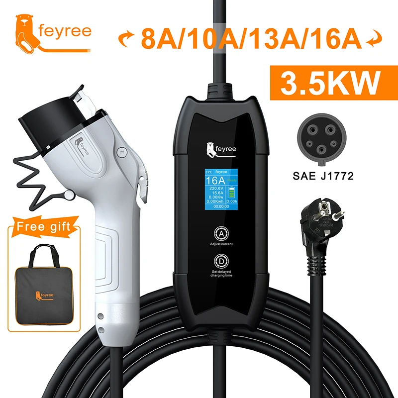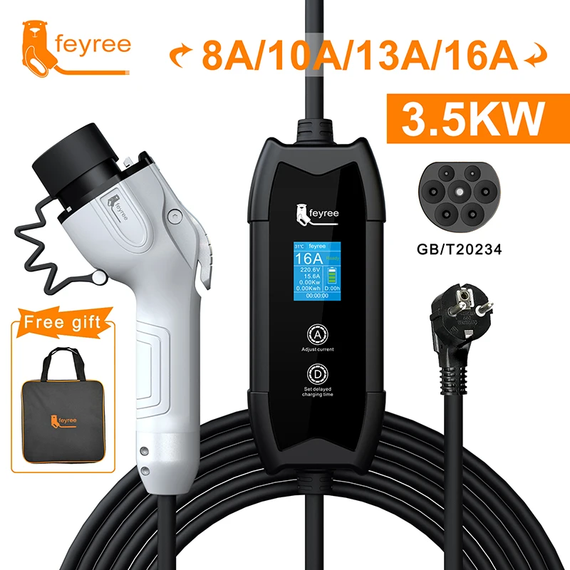 feyree EV Portable Charger Type2 / GB/T Plug Connector 16A 1Phase 3.5KW Type1 3.5m Wallbox Charging Station for Electric Vehicle