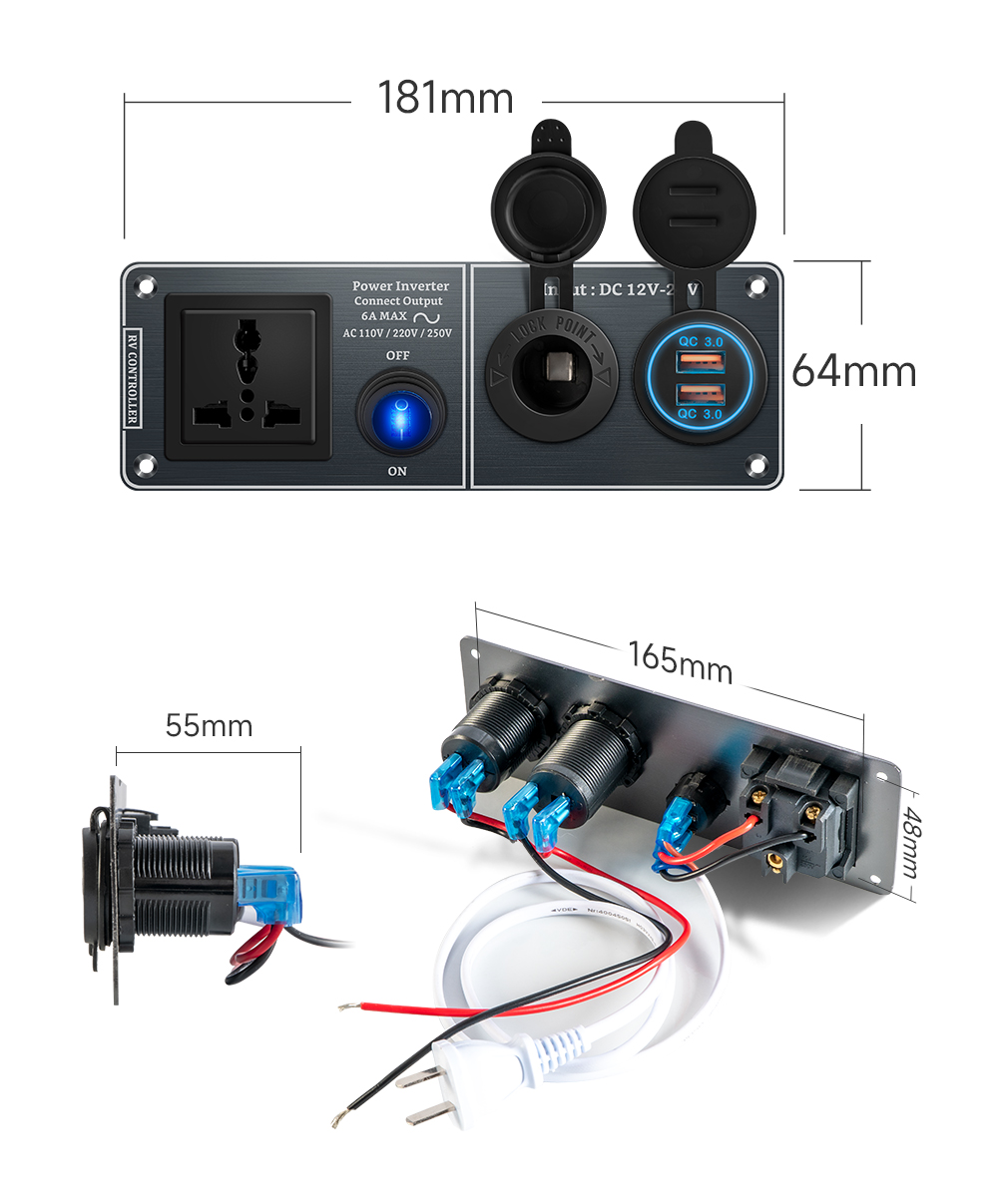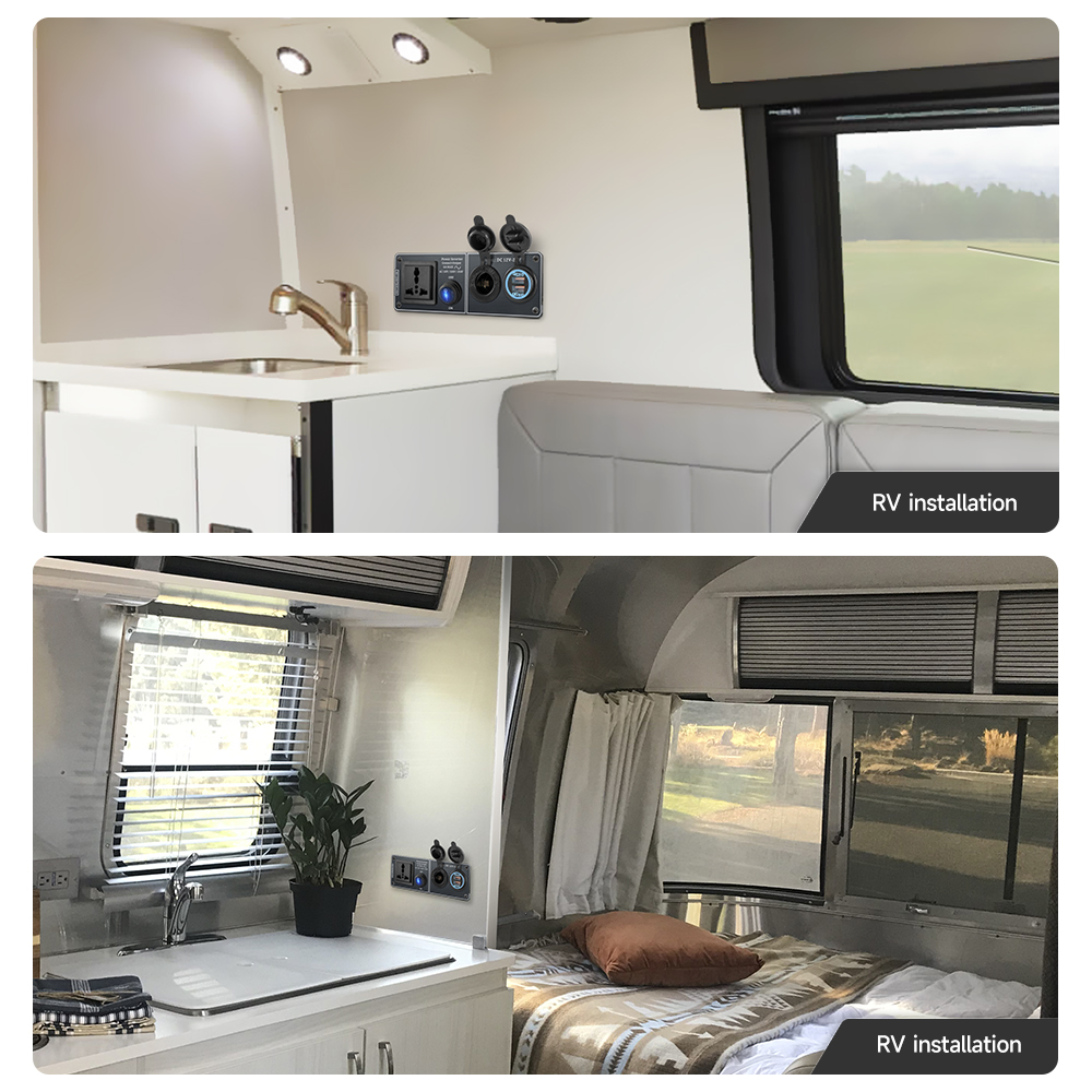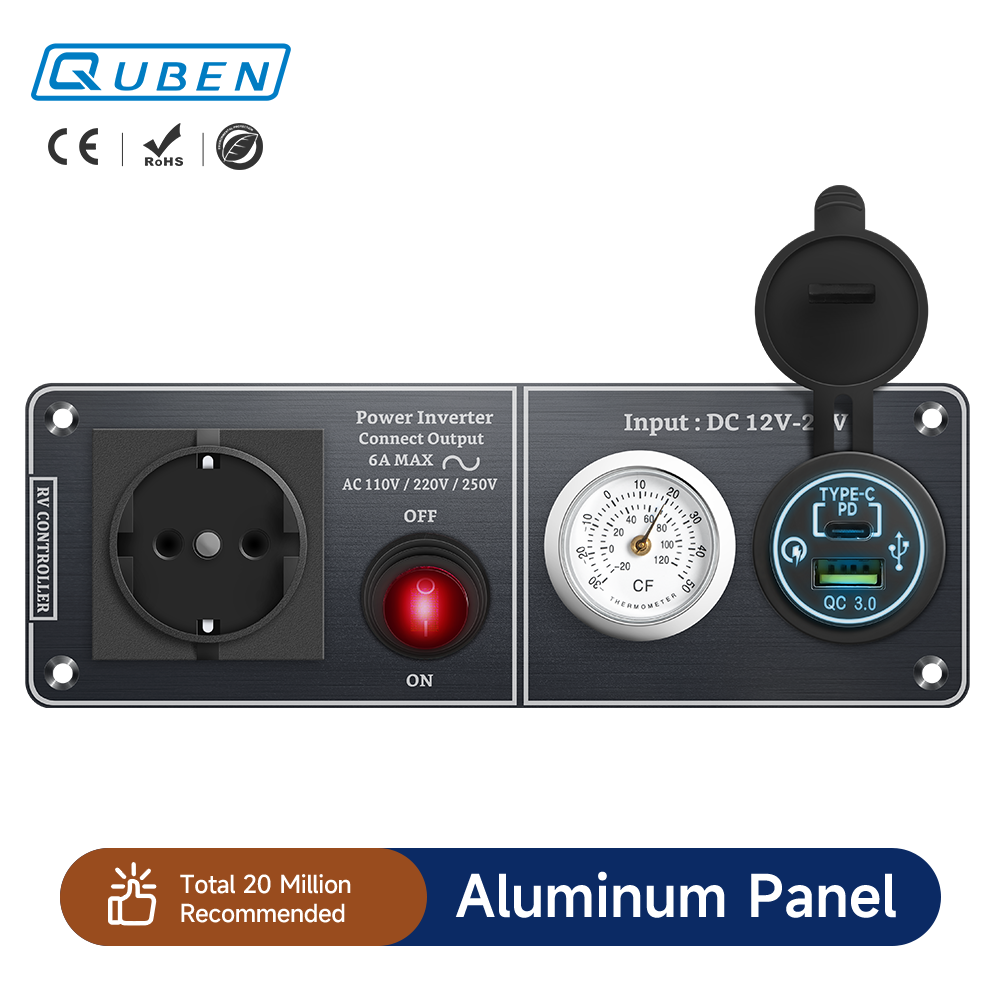 Car Charger Multi-Functions Aluminum Panel Thermometer AC110V 220V Dual Port USB QC3.0 12V 24V for RV Yacht Travel Trailers