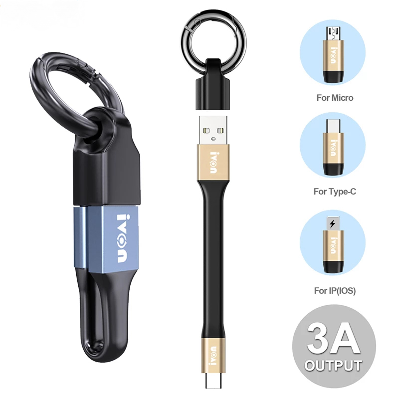 Portable Keychain USB Data Cable 2 in 1 3A Mini USB to Type-C LIGHTNING Micro USB Fast Charging Cable for iPhone Samsung Xiaomi
