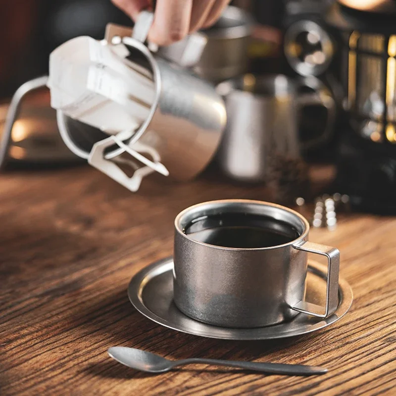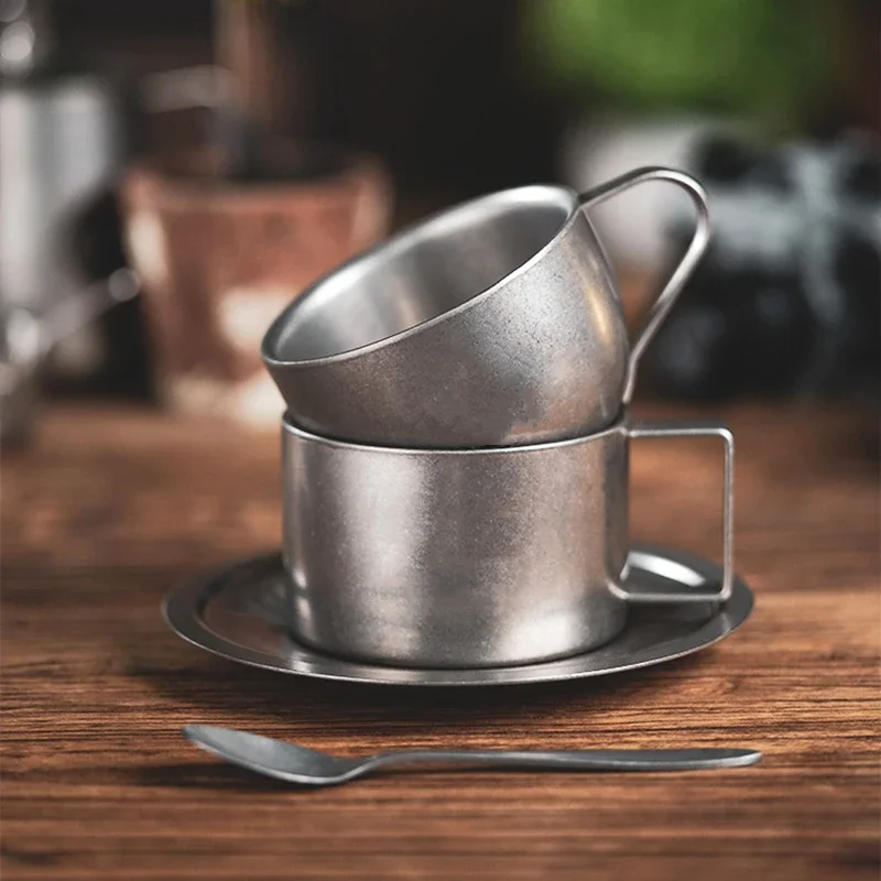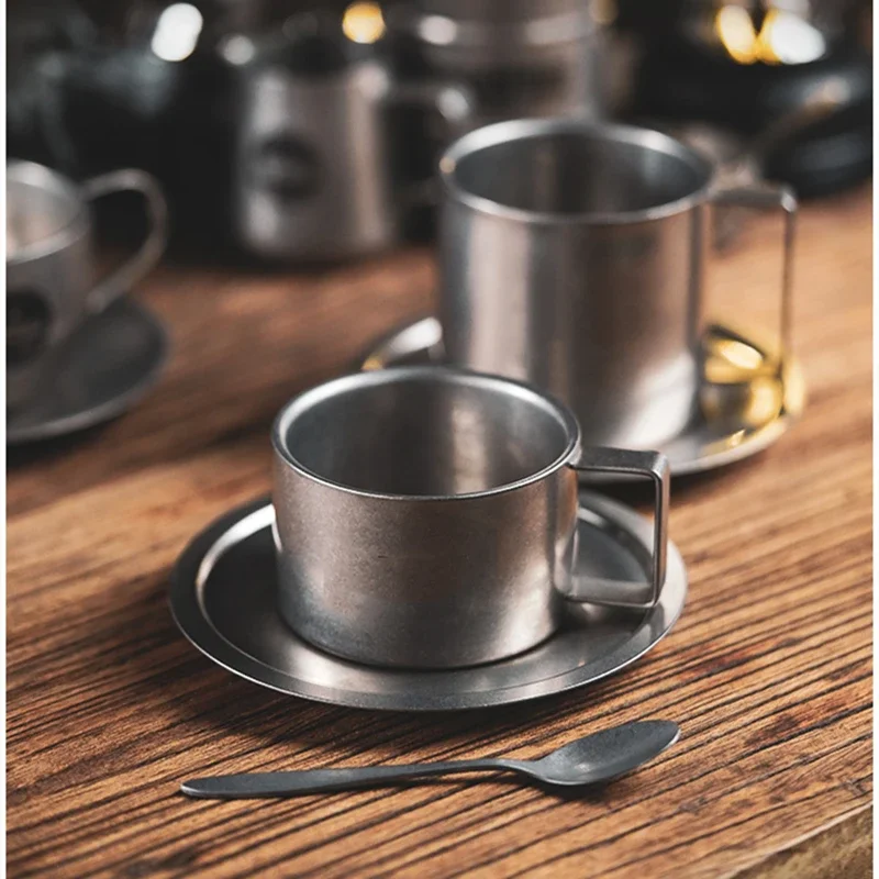 Retro Series Coffee Cup Set Double Wall 304 Stainless Steel with Coffee Spoon Coffee Disc Frosted Industrial Style Tea Cup Set