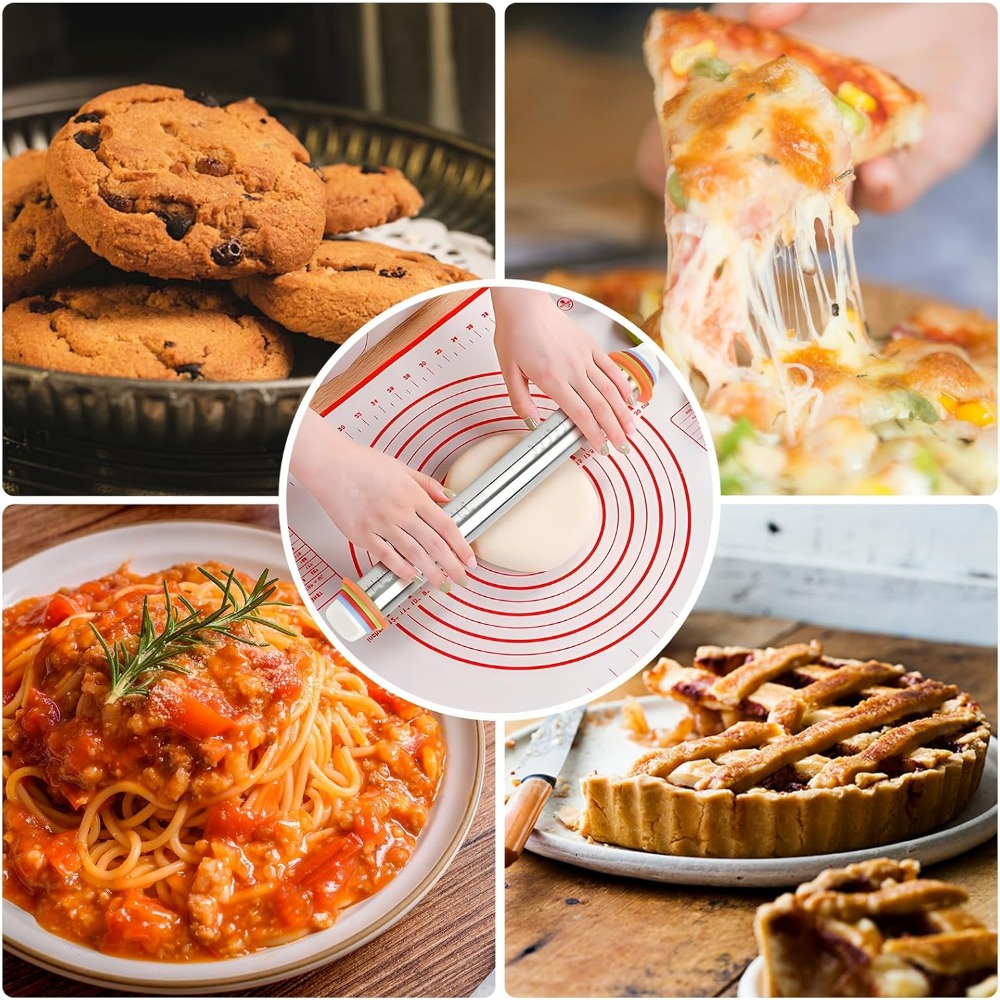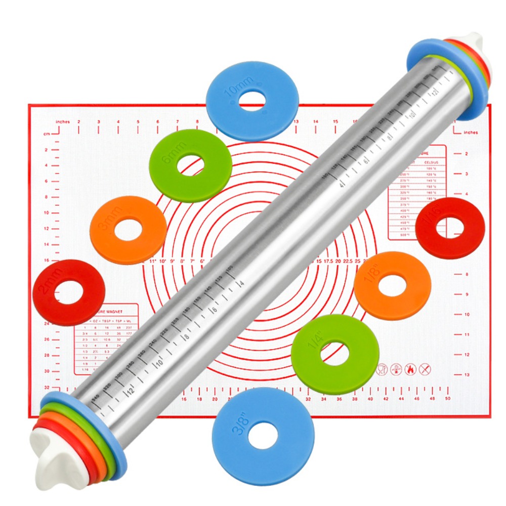 Rolling Pin and Silicone Baking Pastry Mat Set Stainless Steel Dough Roller with Adjustable Thickness Rings Baking Essentials