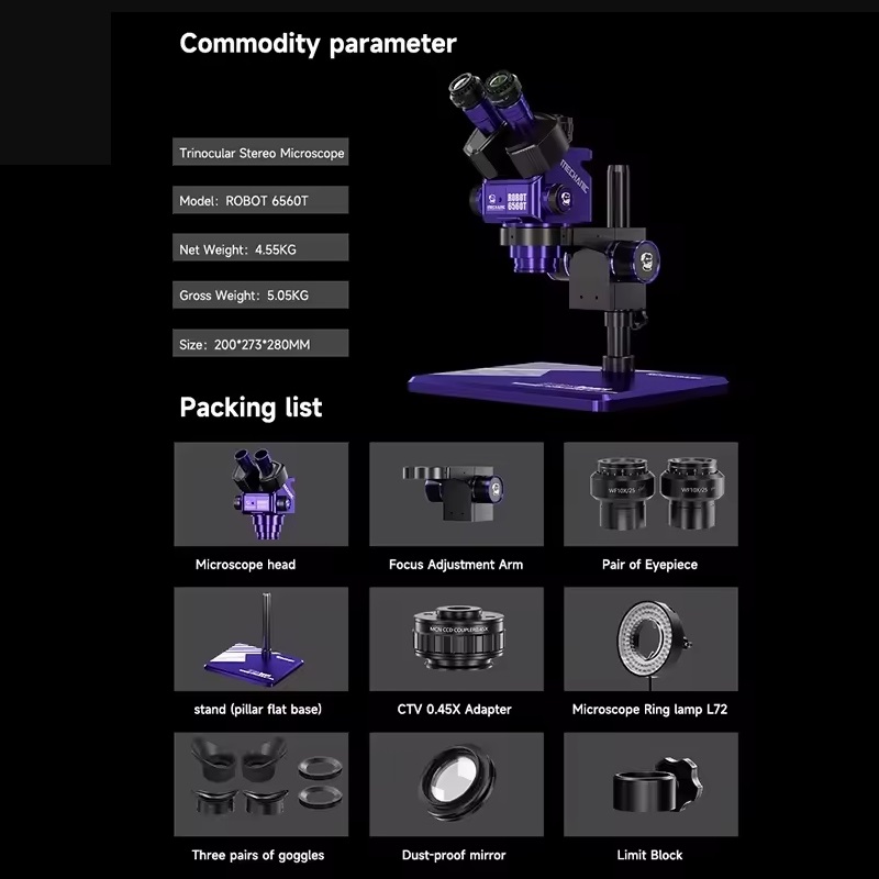 MECHANIC ROBOT 6560T-B11 Trinocular Stereo Industrial Microscope 6.5-60X Continuous Zoom WF10X25 Eyepiece 0.45X Camera Adapter