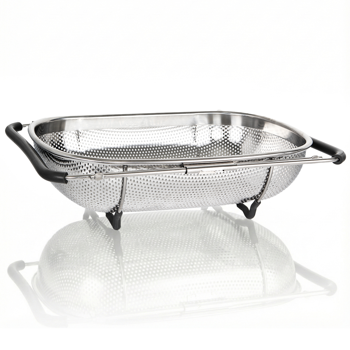 tastyWay 1 Set Stainless Steel Over Sink Colander with Telescopic Handle - Metal Mesh Strainer Basket for Washing Fruits & Veget
