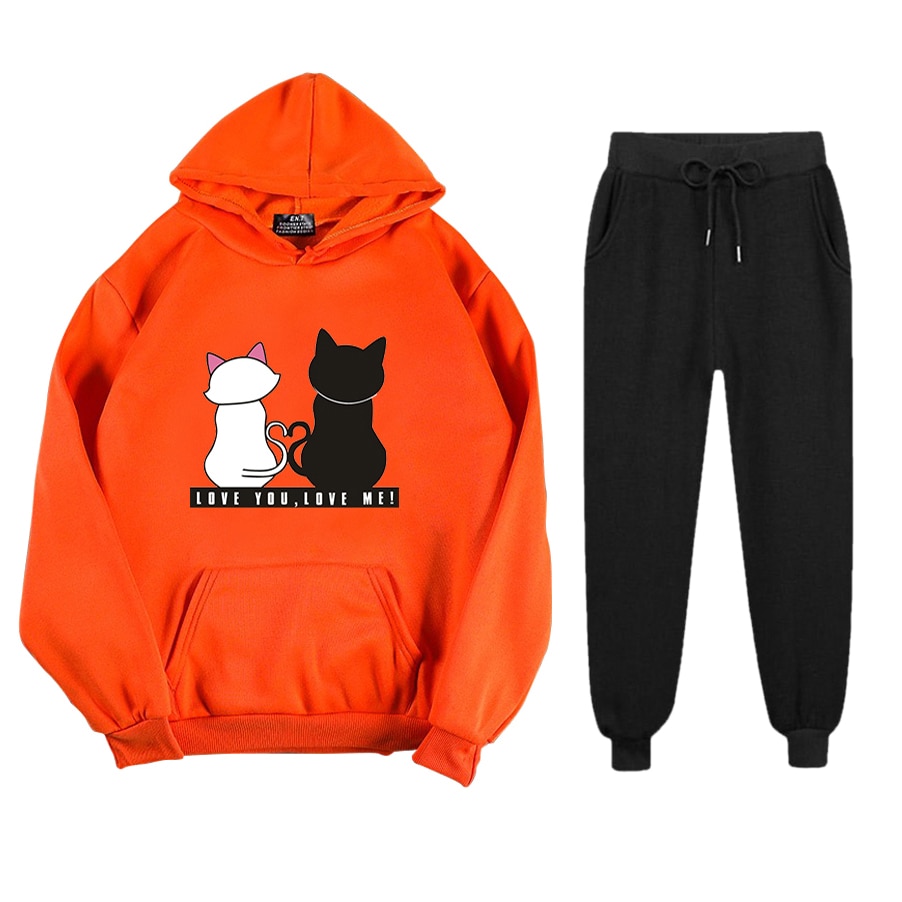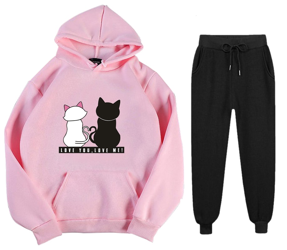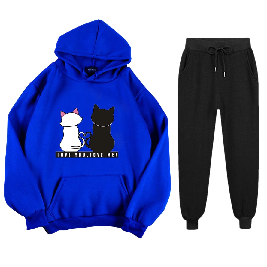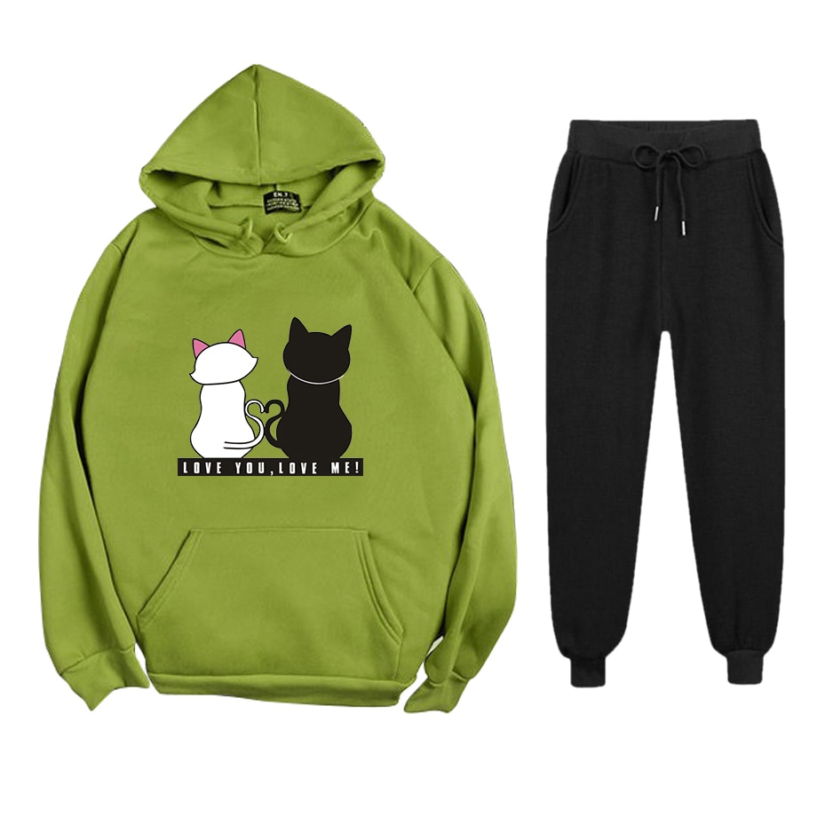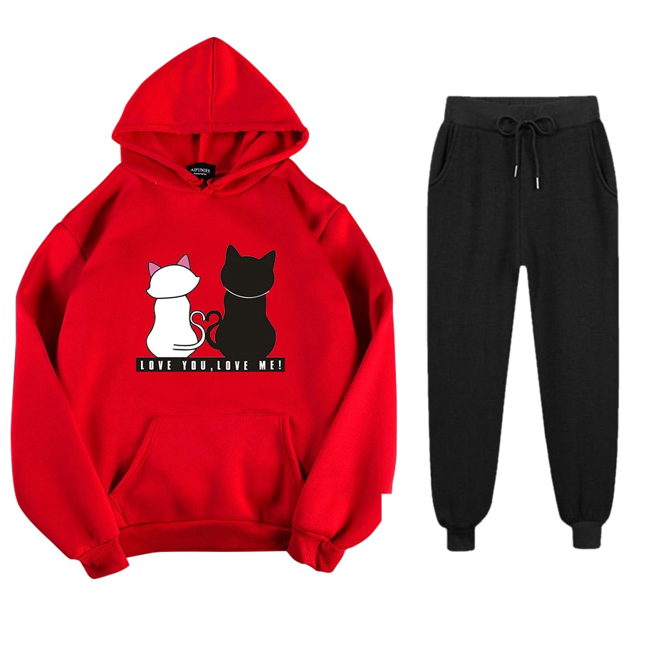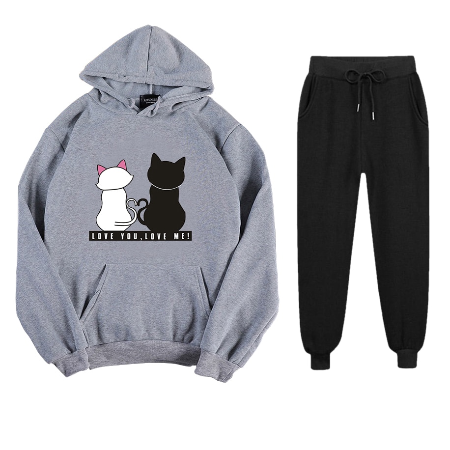 Abrini Women Autumn Fleece Tracksuits Harajuku Cats Print Sets Hoodies and Trousers Two pieces Sets Women 2021 Winter