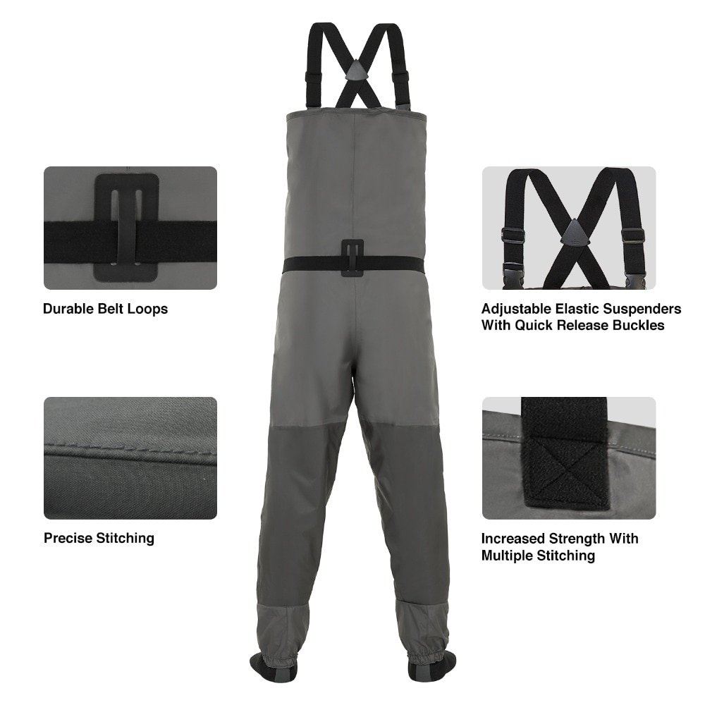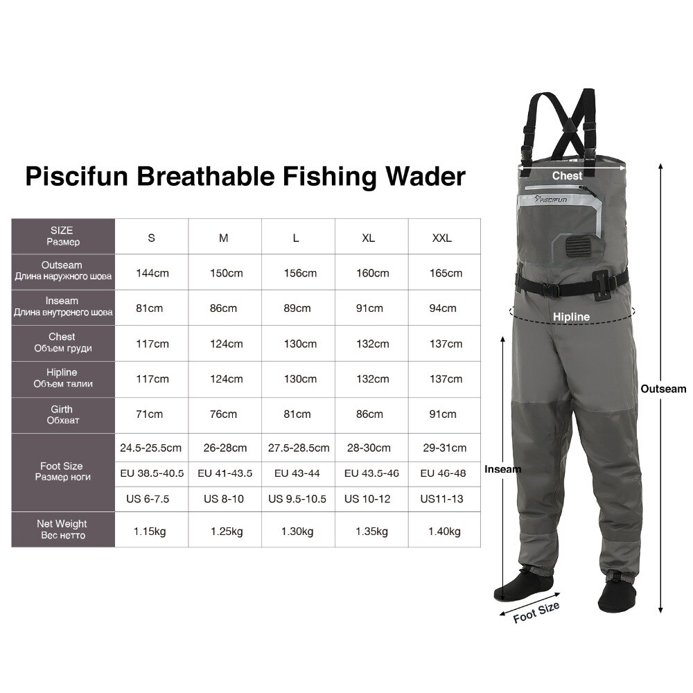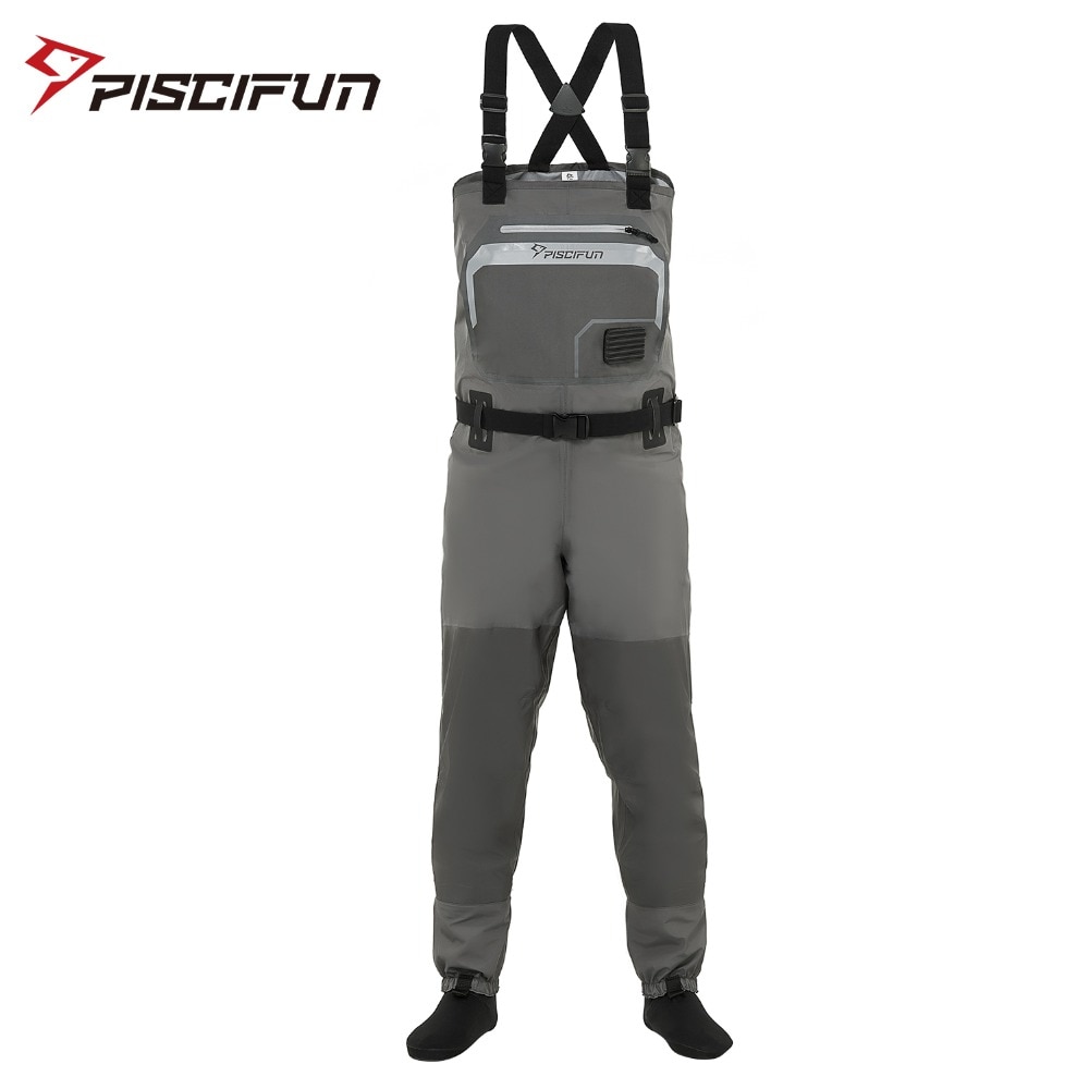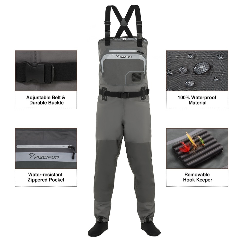 Piscifun 3-Layer Polyester Breathable Waterproof Stocking Foot Fly Fishing Chest Waders Pant for Men and Women with Phone Case