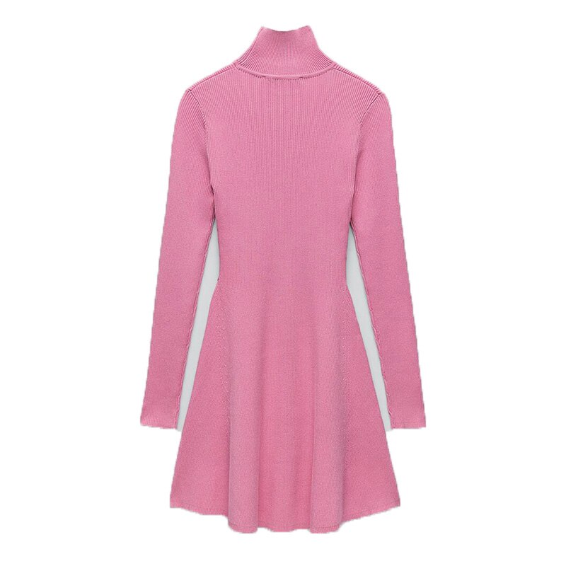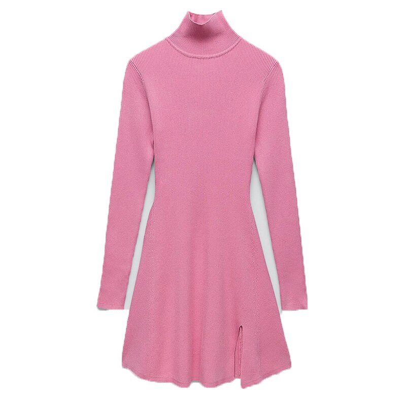2021 Women Fashion Chic Pink Side Split Slim Knitted Mini Dress Female Elegant Turtleneck Long Sleeve Dresses Vestidos