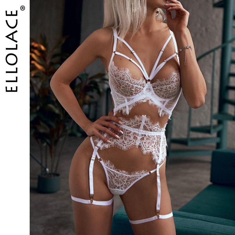 Ellolace Erotic Lingerie Sexy Underwear Lace Hollow Out Transparent Exotic Sets Sensual Underwire Bra and Panty Set with Garters
