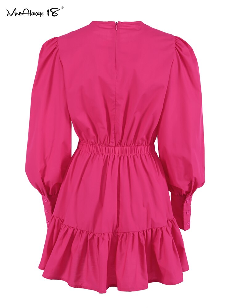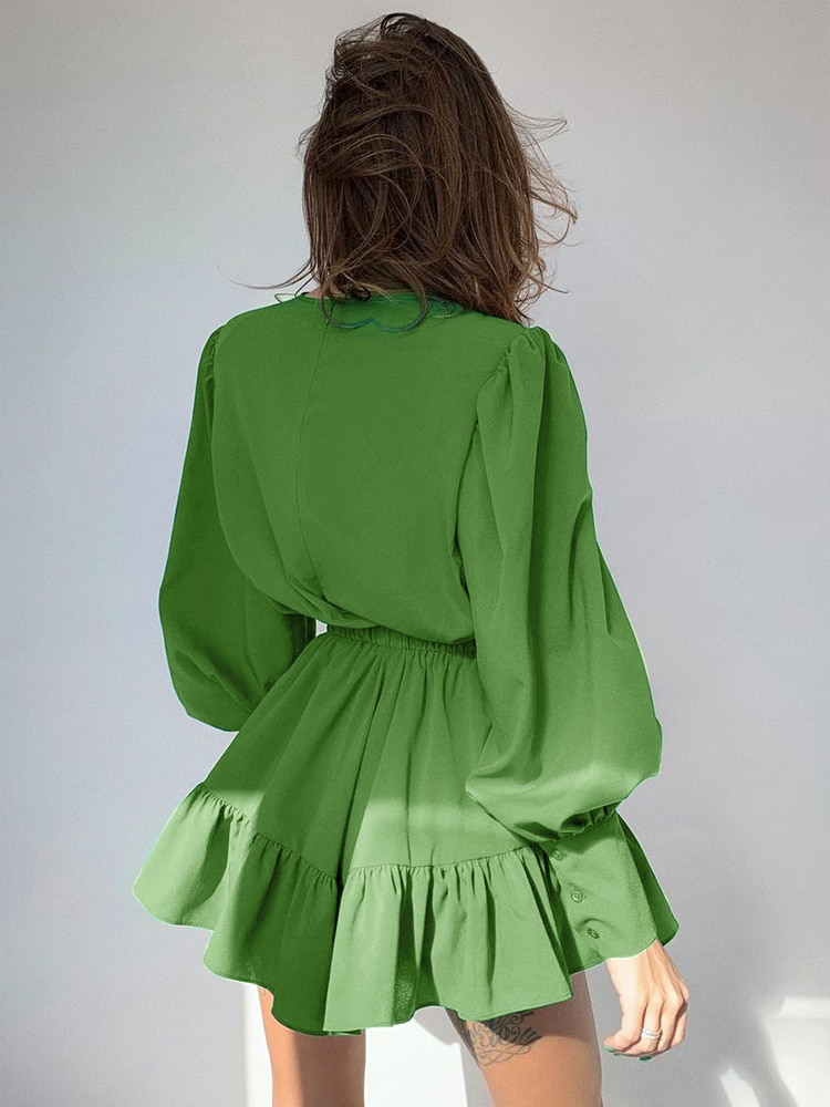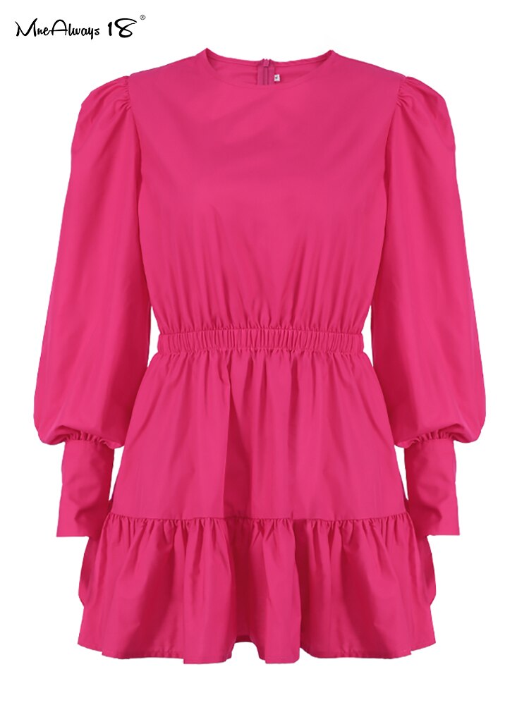 Mnealways18 Lantern Sleeve Vintage Dress Long Sleeve O-Neck Casual Women Ruffle Dress Short Mini Pleated A-Line Frill Dress Lady