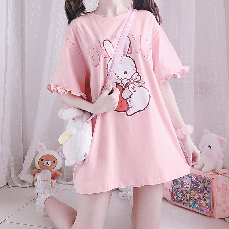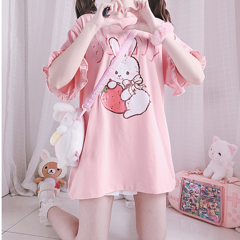 Summer Women Cute Lolita Pink T-Shirts Cartoon Strawberry Rabbit Print Tshirt Ruffles Short Sleeve Tops JK Girls Kawaii Tee Top
